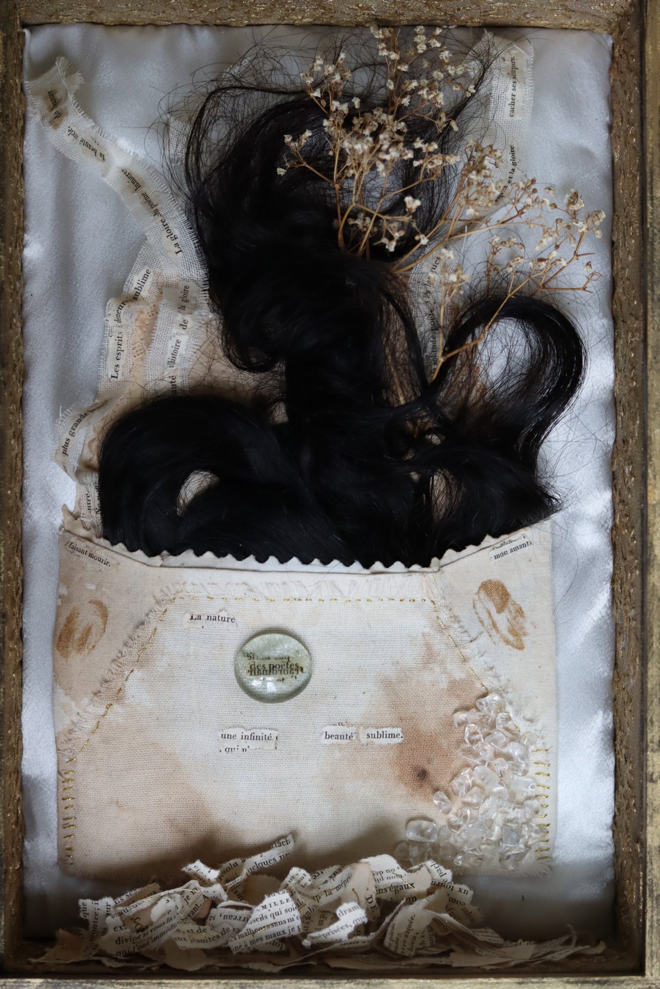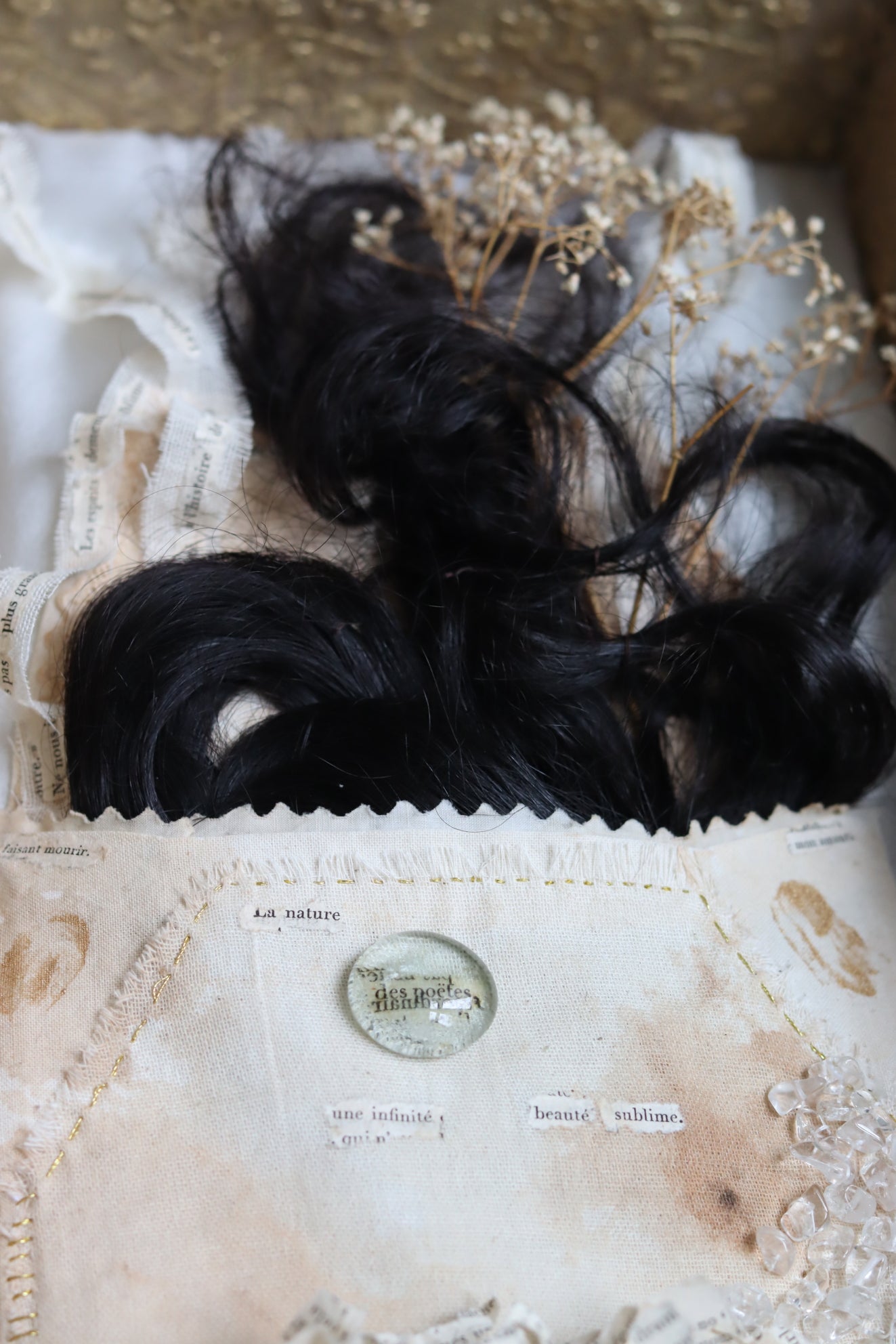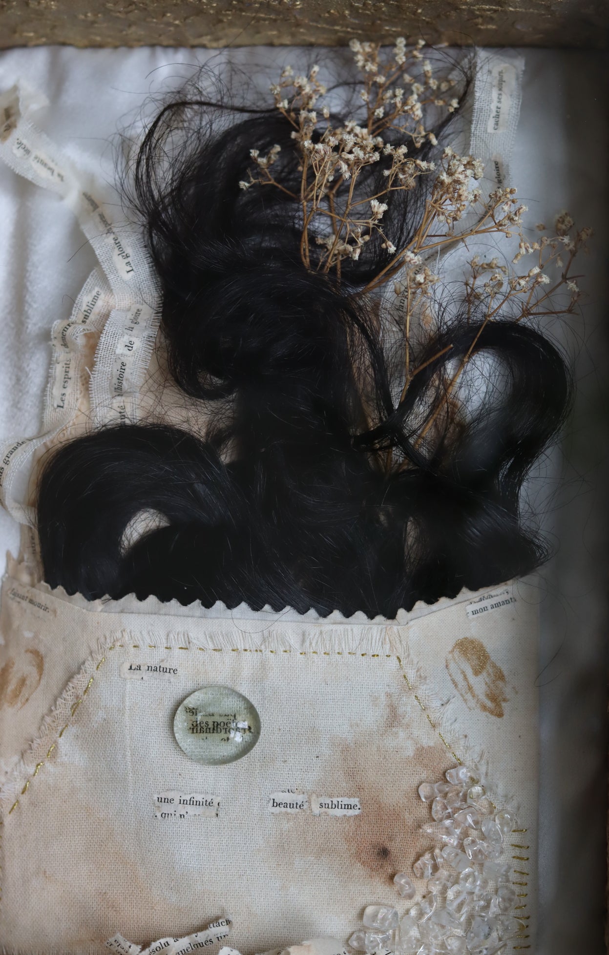 Inside it is a handsewn textile envelope filled with human hair, dried Baby Breath flowers