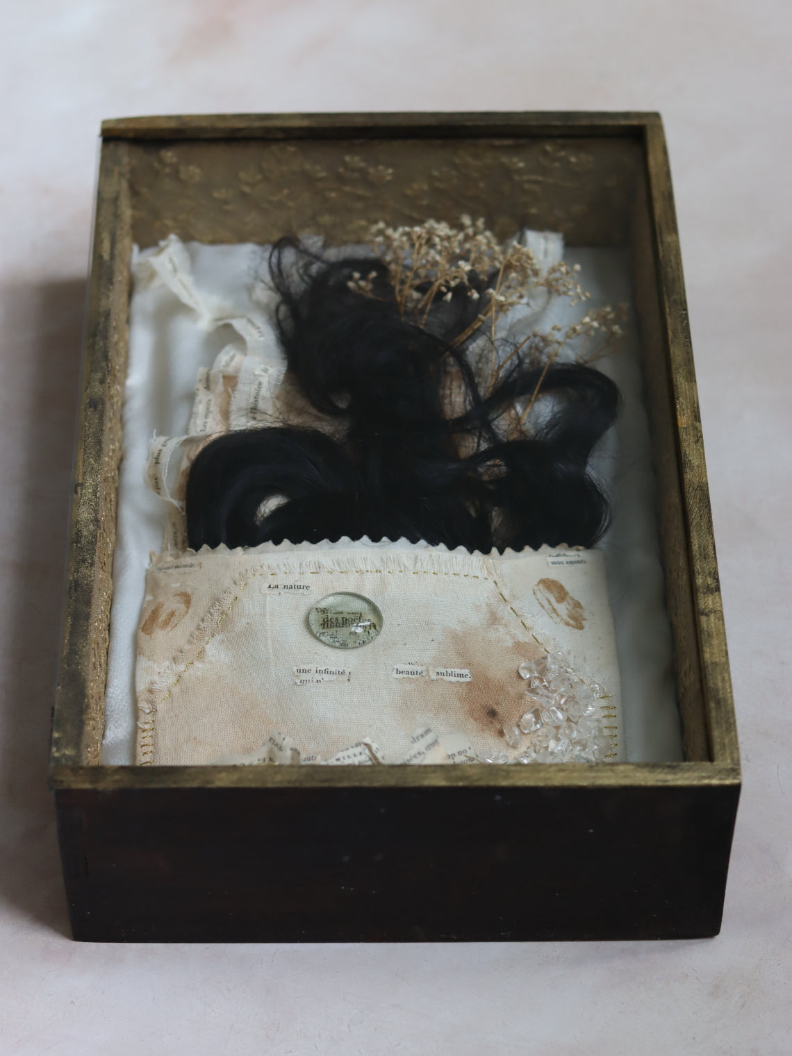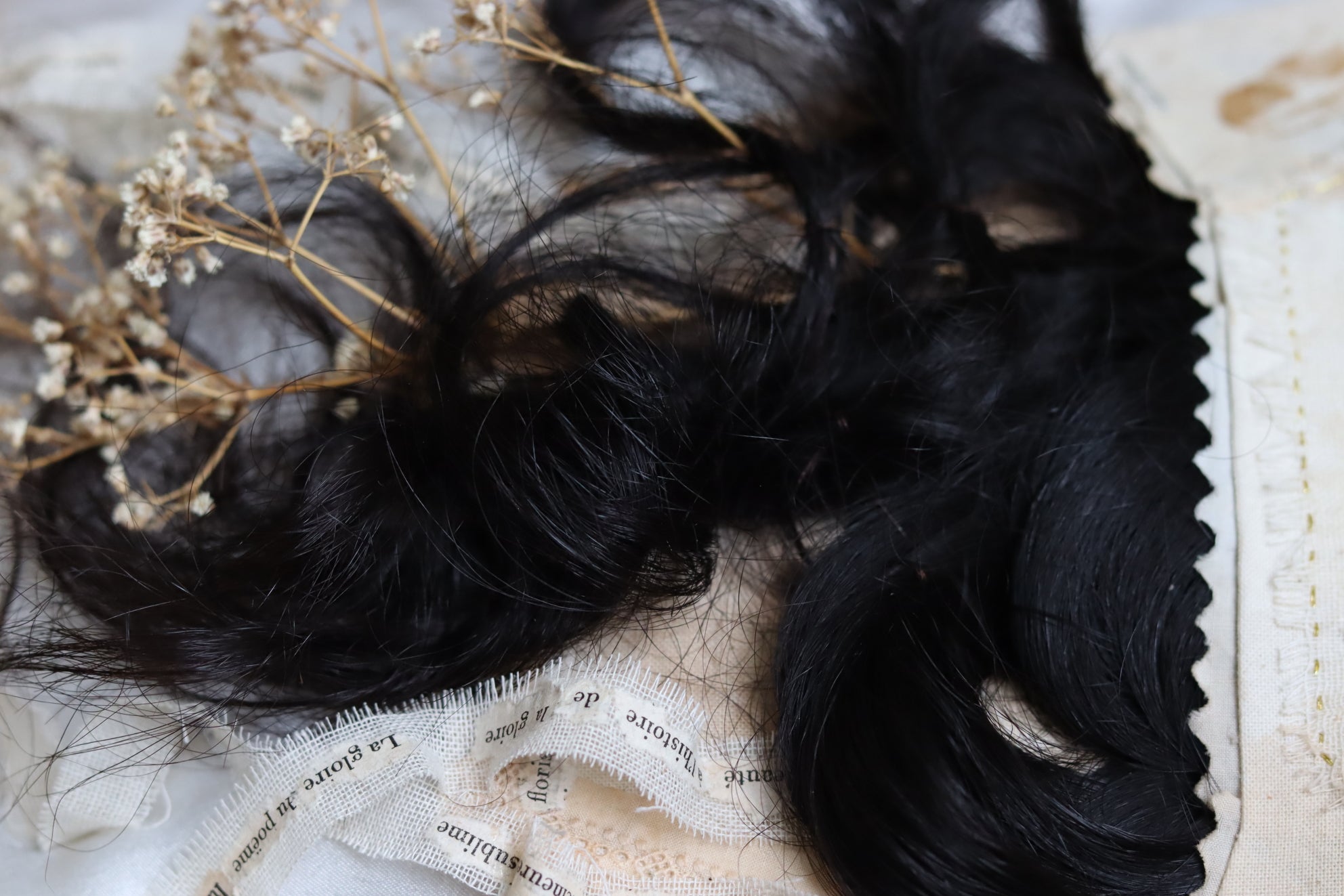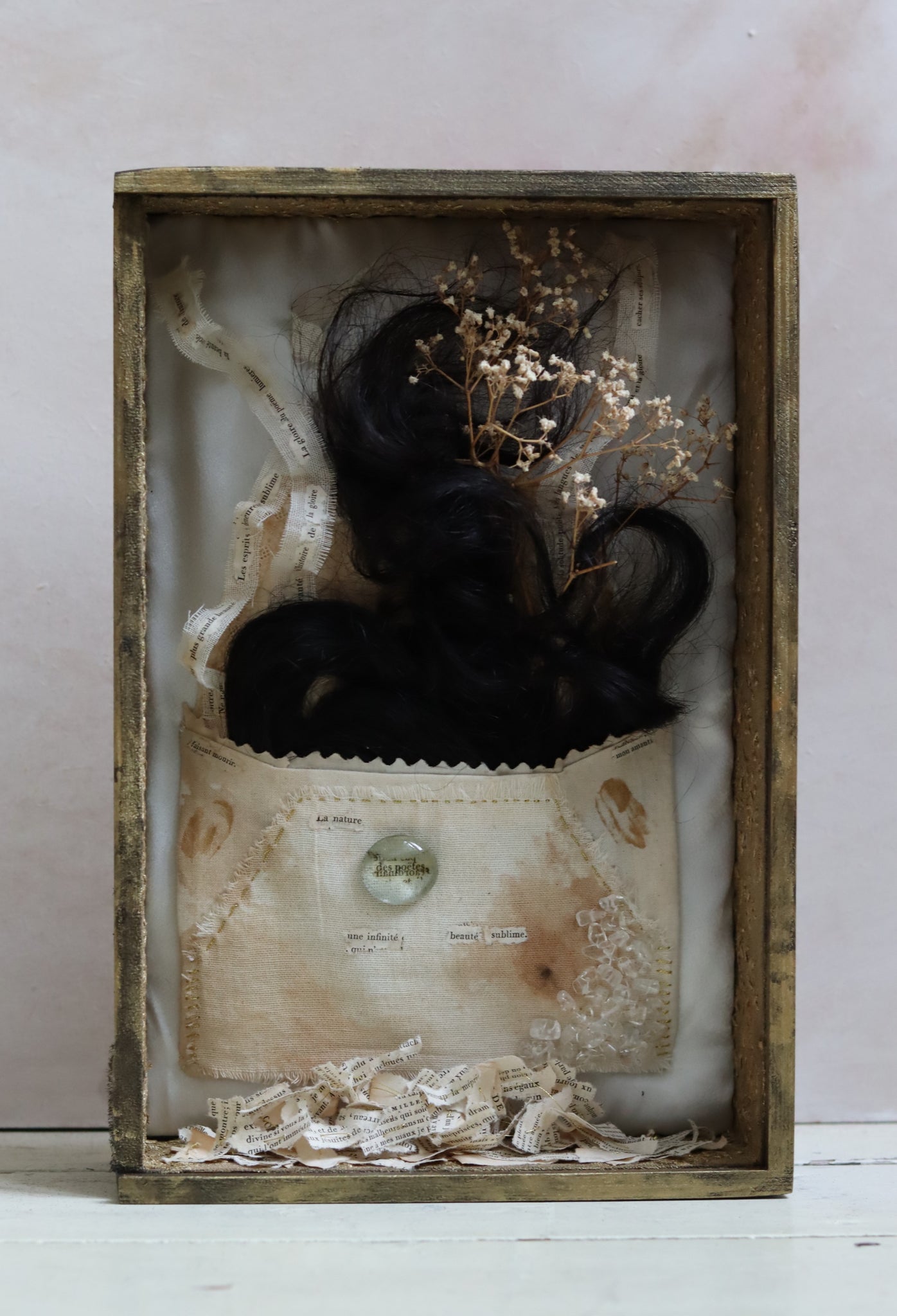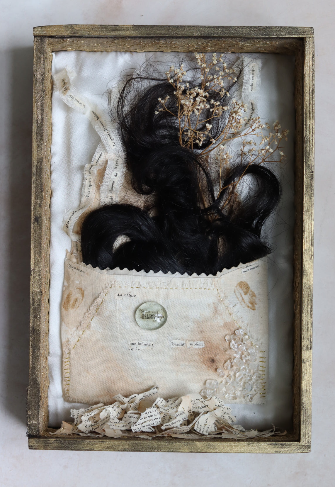 Inside it is a handsewn textile envelope filled with human hair, dried Baby Breath flowers