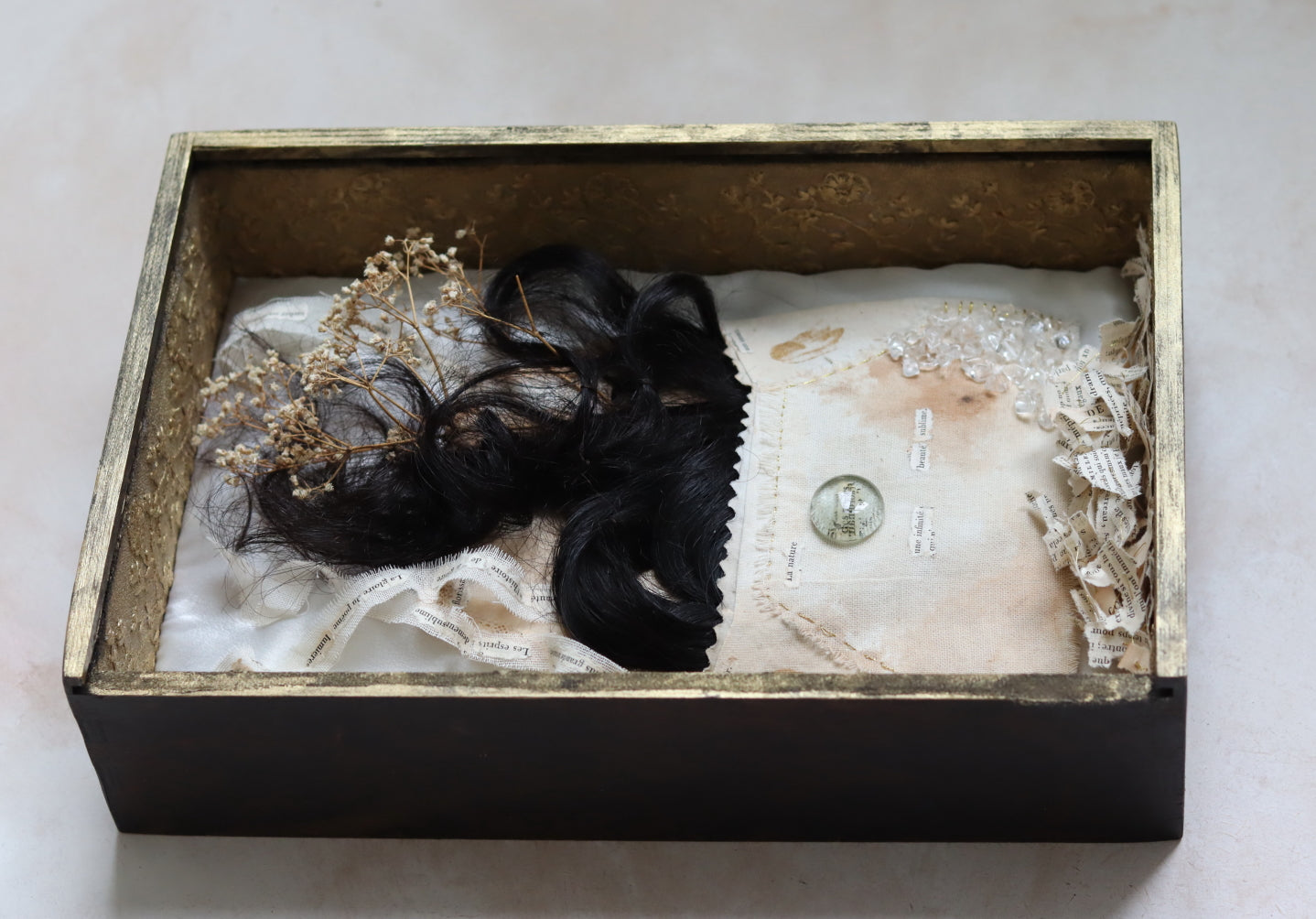 On the floor of the box pieces from an antique French poetry book are sewn together on a string of thread