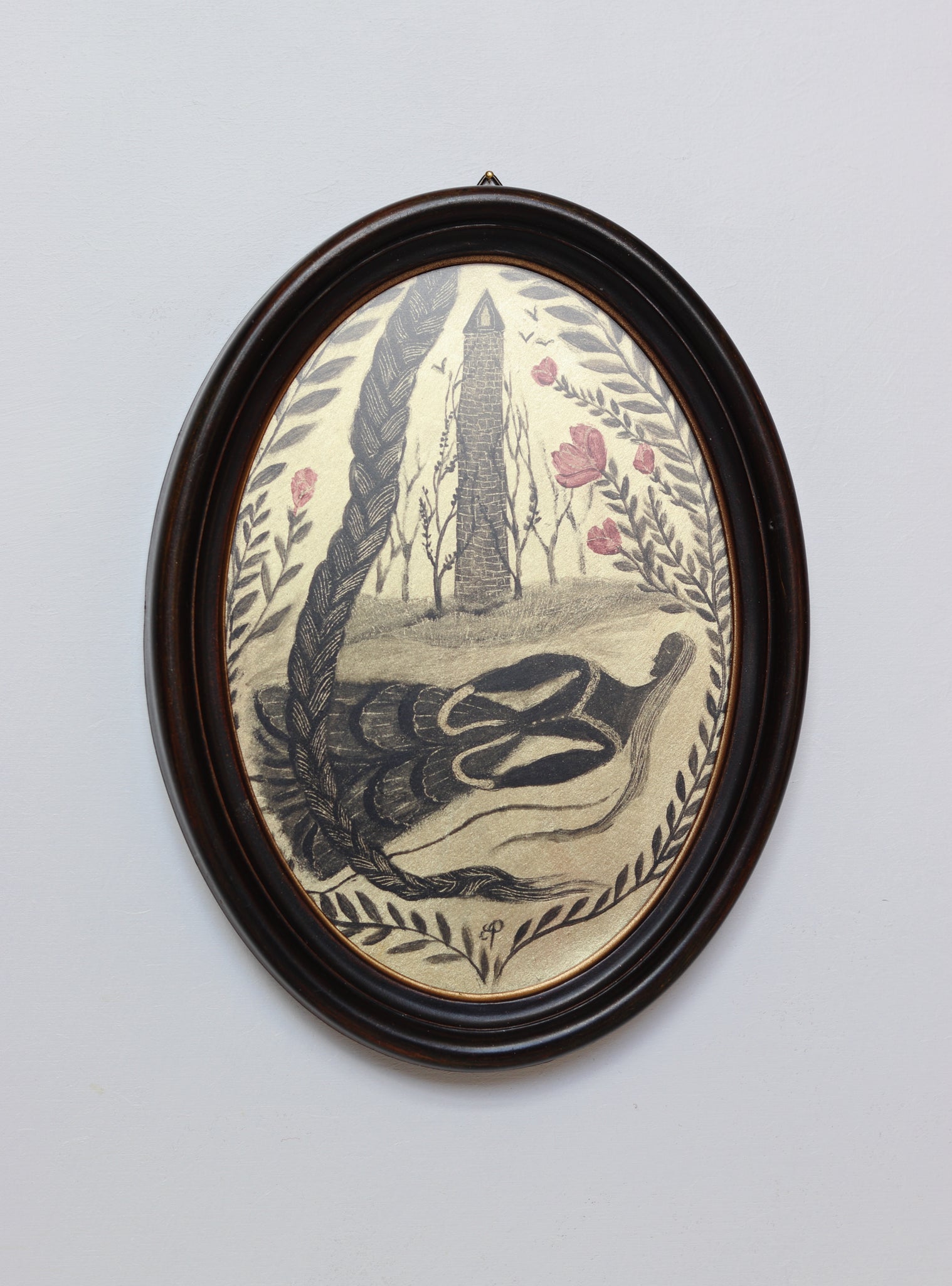 A silhouette painting on luminous gold in an oval vintage frame, ready to hang