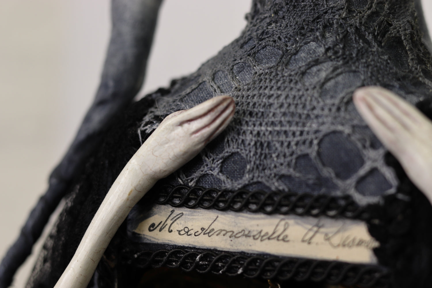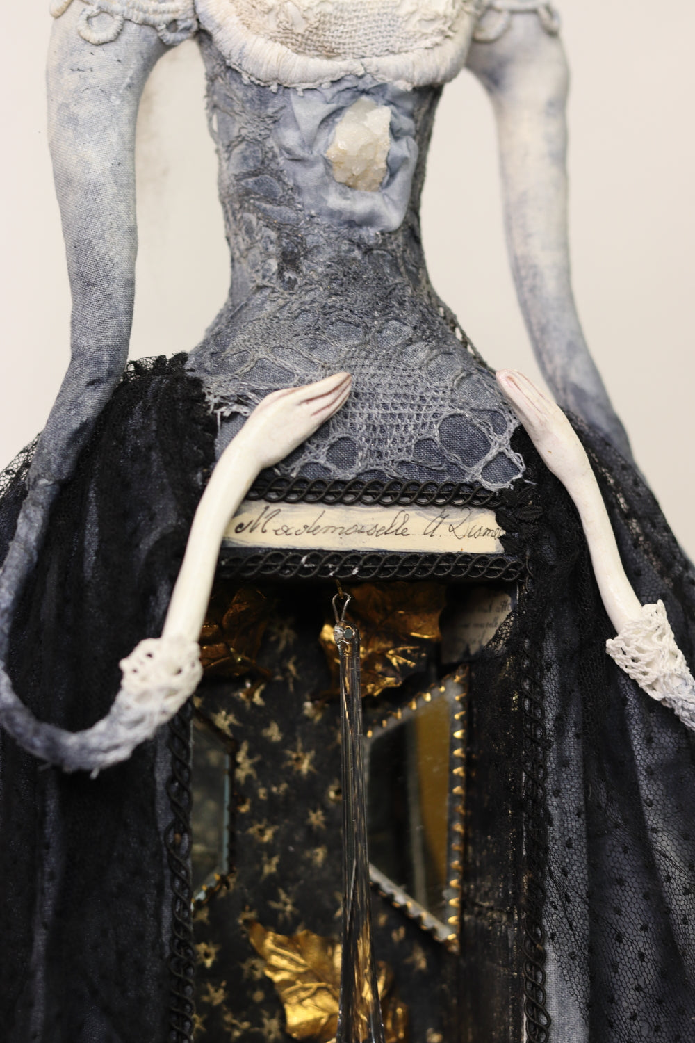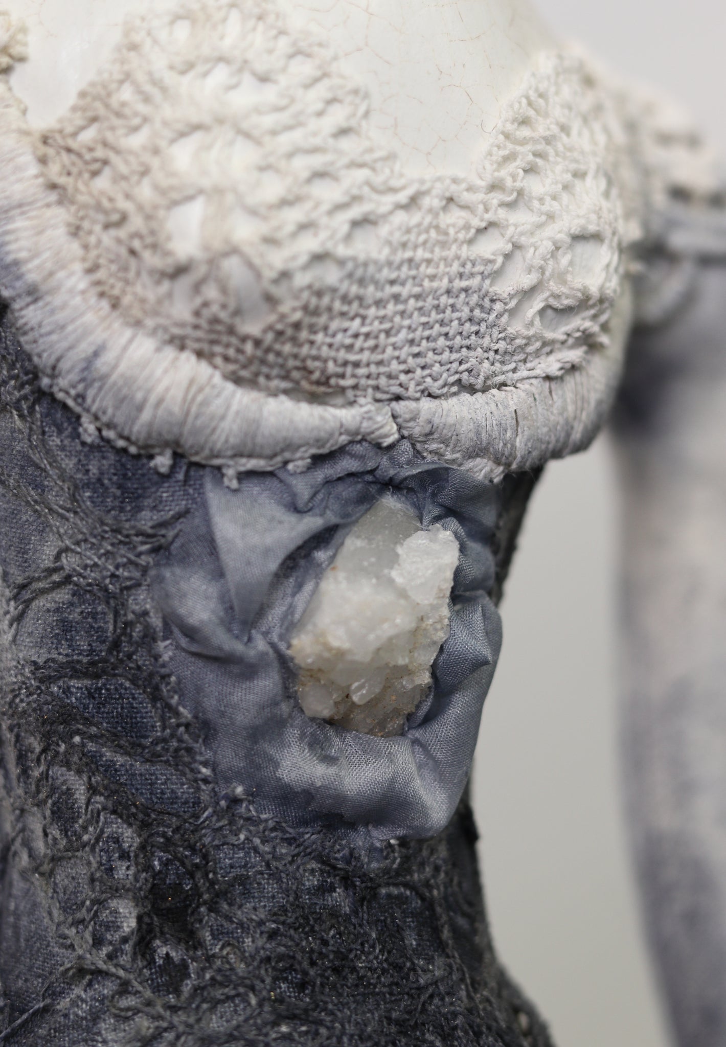 The doll is made of textiles, clay, antique black lace and wool and she carries a little mountain crystal inside her chest.