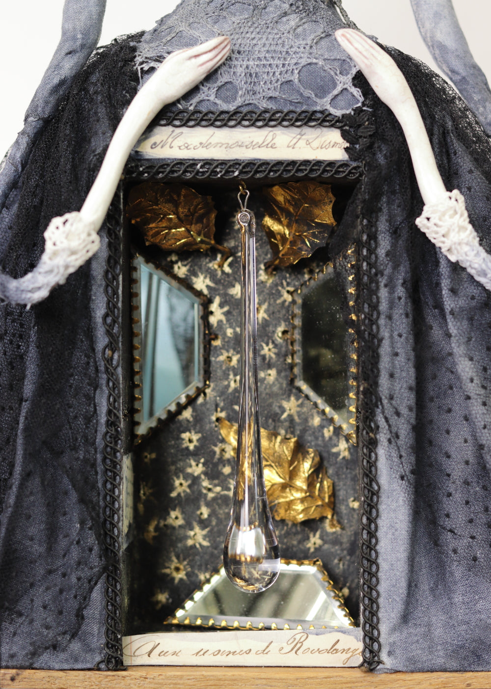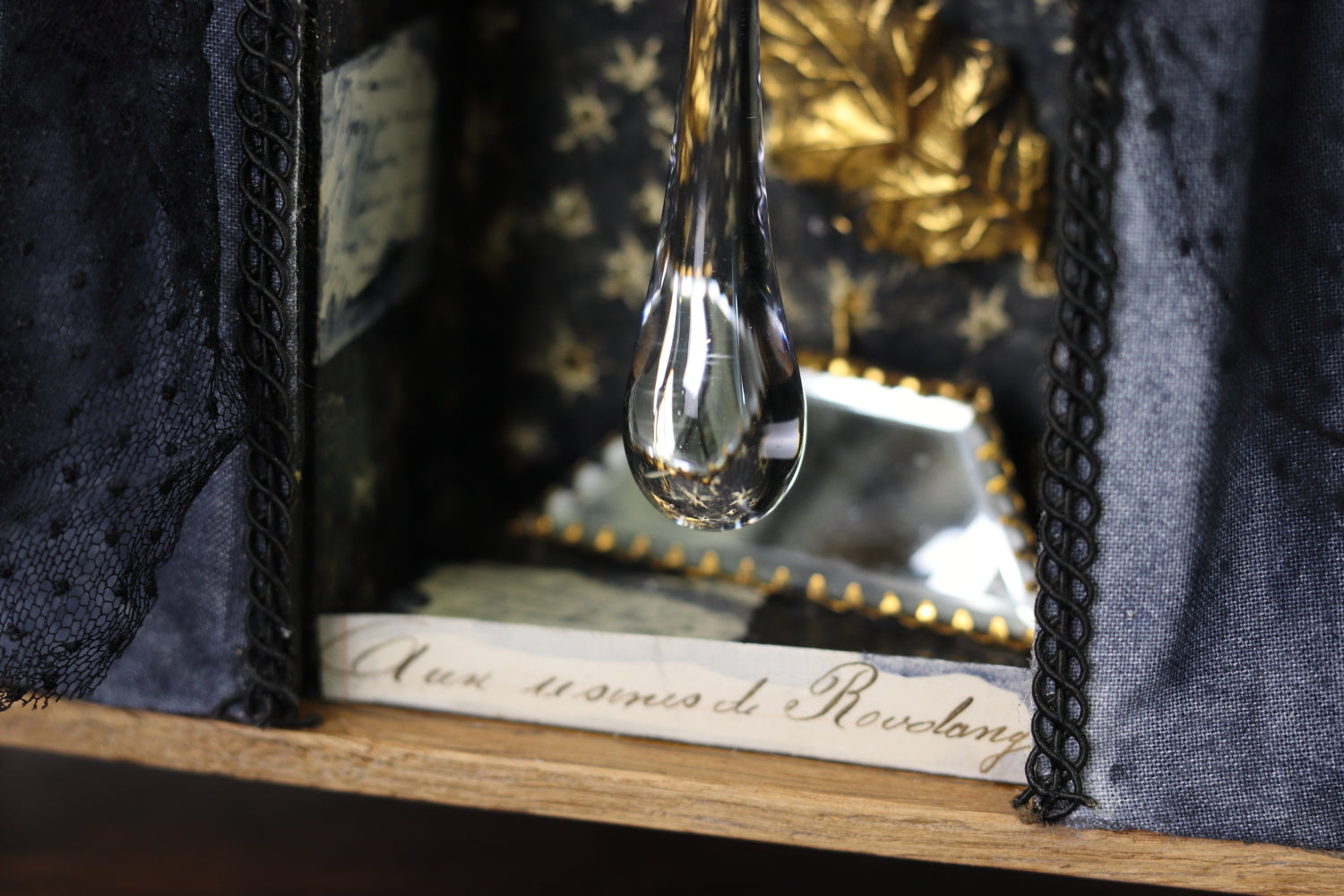 Inside the theatre box I placed small mirrors and gilded flowers from an 18th century French Globe de Mariée (Marriage Dome) and a gorgeous glass pendulum that hangs suspended like an enormous tear, reflecting the tiny golden stars that are painted on the walls of the theatre and the mysterious handwritten text from the antique postcards.