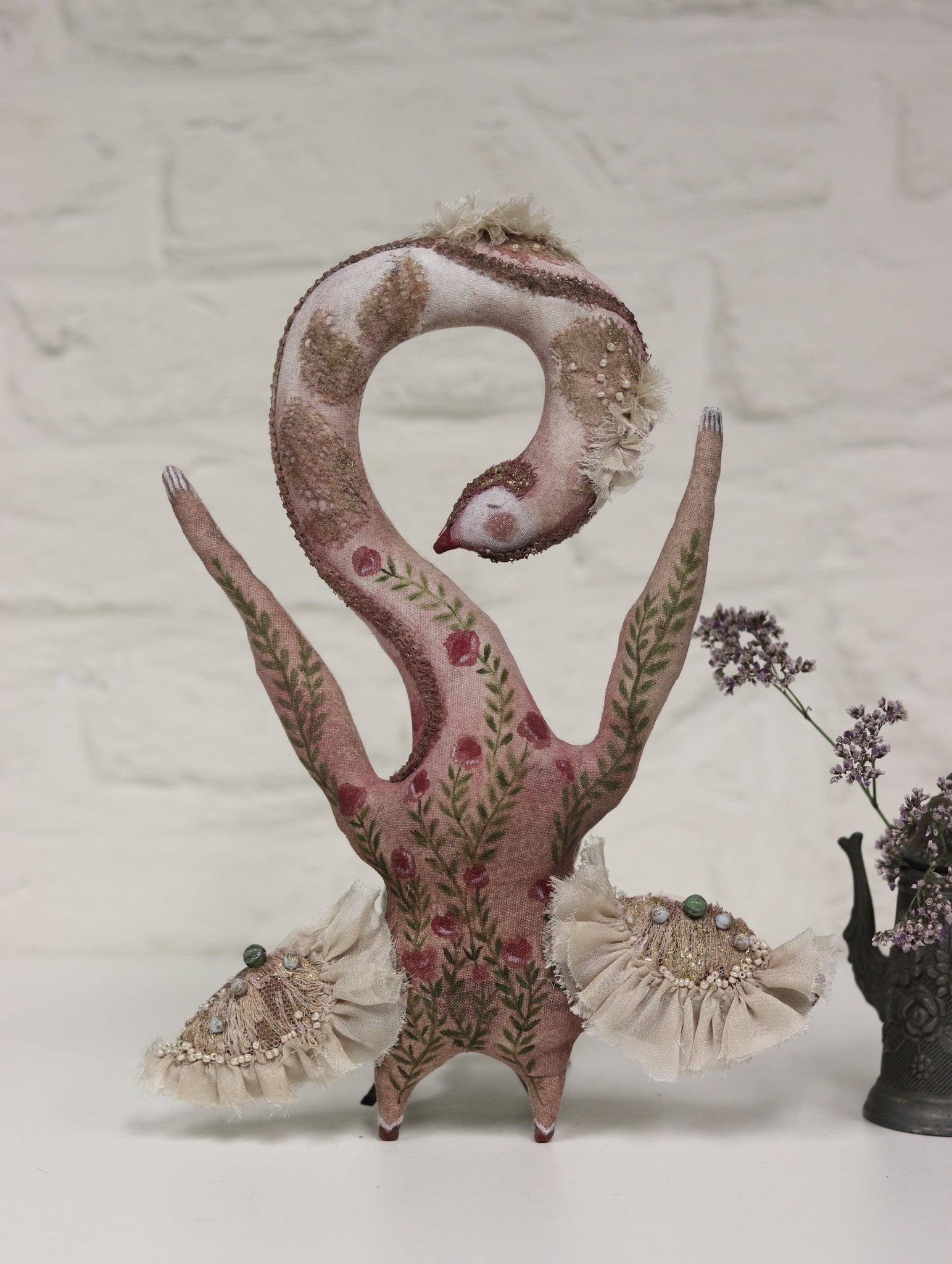 She is handmade and painted in dusky pinks and roses with lace and beaded details.